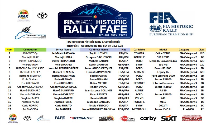 O Historic Rally Fafe (7/8 novembro), que faz a sua estreia no Campeonato da Europa FIA de Ralis Históricos (CERH), apresenta uma lista de inscritos de luxo, ao incluir nada menos que os 5 primeiros classificados da tabela absoluta, numa jornada decisiva para a consagração de três campeões (Categoria 2, Categoria 4 e Geral Absoluta). As classificativas de asfalto da “catedral” nortenha dos ralis vão ser palco de momentos nostálgicos para os entusiastas do desporto automóvel ao acolherem a passagem de “máquinas” como o Toyota Celica Turbo 4WD de Jari-Matti Latvala, o BMW M3 de Will Graham, o Subaru Legacy 4WD Turbo de Richard Genesca ou o Renault 5 Turbo Cevennes de Philippe Mermet, entre outros. Rui Madeira (Mitsubishi Lancer Evo III), ex-campeão mundial de Produção, será o único piloto português em prova.