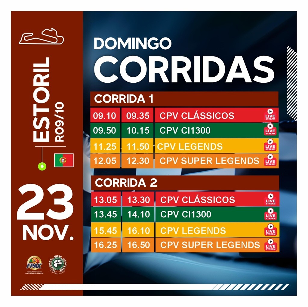 Os aguerridos bólides do Campeonato de Portugal de Velocidade Clássicos e Legends 1300 (CPVCL 1300) da ANPAC encerram a temporada no Autódromo do Estoril. Apesar da cilindrada, a competitividade é máxima e a majoração de pontos na última jornada garante que a decisão do título absoluto será uma das mais disputadas.