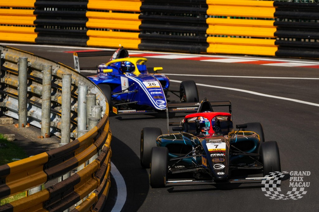 But Chinese F4 champion Shimo Zhang, who had started seventh, lost the rear end of his car at Mandarin Bend. And, as he speared across the track, he collected the unfortunate Japanese F4 runner-up Itsuki Sato, forcing both out of the race. Down at Lisboa Bend, Kyuho Lee hit the barriers and the safety car was called out to allow the stricken cars to be retrieved.