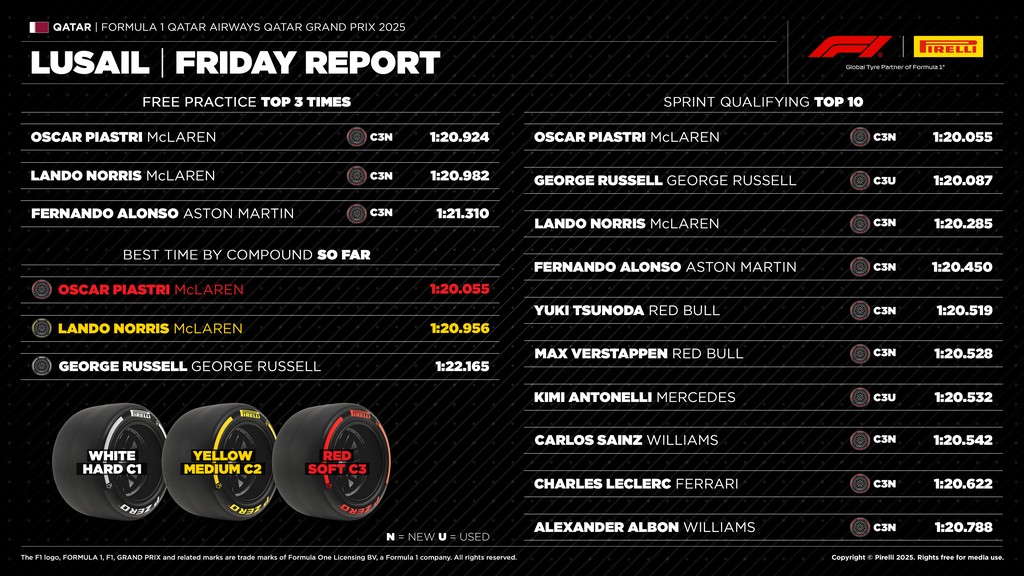 Piastri also set a new track record at Lusail and claimed the top spot earlier in FP1 – making a perfect start to a crucial weekend. Piastri’s time of 1m20.055s on the P Zero Red soft beat the previous fastest lap of Lusail (1m20.520s) set by Red Bull driver Max Verstappen to claim pole last year.