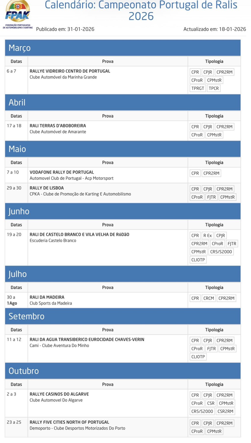 Informações desportivas CPR 2026