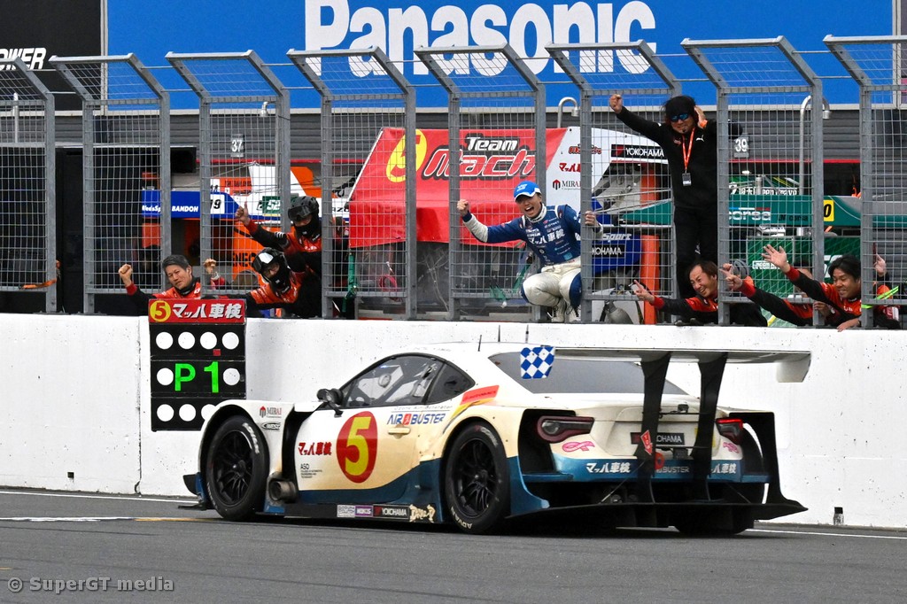 The MOTEGI GT 300km RACE GRAND FINAL, Round 8 of the 2025 AUTOBACS SUPER GT series, took place on November 2nd (Sun.) at Mobility Resort Motegi (4,801m x 63 laps) in Tochigi Prefecture. At the end of the fierce competition that played out at Motegi, the No. 1 au TOM'S GR Supra (Sho Tsuboi / Kenta Yamashita) won its third race to the season to take the GT500 championship title, while Tsuboi became the first in SUPER GT history to win three consecutive titles. In the GT300 class, the No. 5 MACHSYAKEN AIR BUSTER MC86 MACH GO (Yusuke Shiotsu / Iori Kimura) got its first win as a