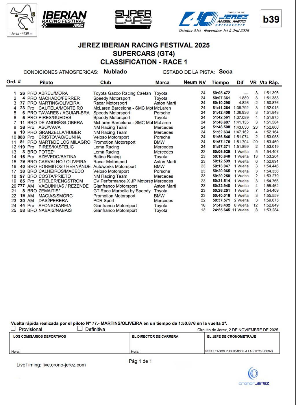 O triunfo ficou nas mãos de Francisco Abreu e Francisco Mora, no Toyota GR Supra GT4 EVO2 da Toyota Gazoo Racing Caetano Portugal, que partiram da terceira posição. A dupla portuguesa soube gerir a corrida com inteligência: Abreu fez uma primeira parte controlada e estratégica, enquanto Mora adoptou um ritmo de ataque na fase final, aproveitando da melhor forma a neutralização do Safety-Car para conquistar a liderança e garantir uma vitória importante.