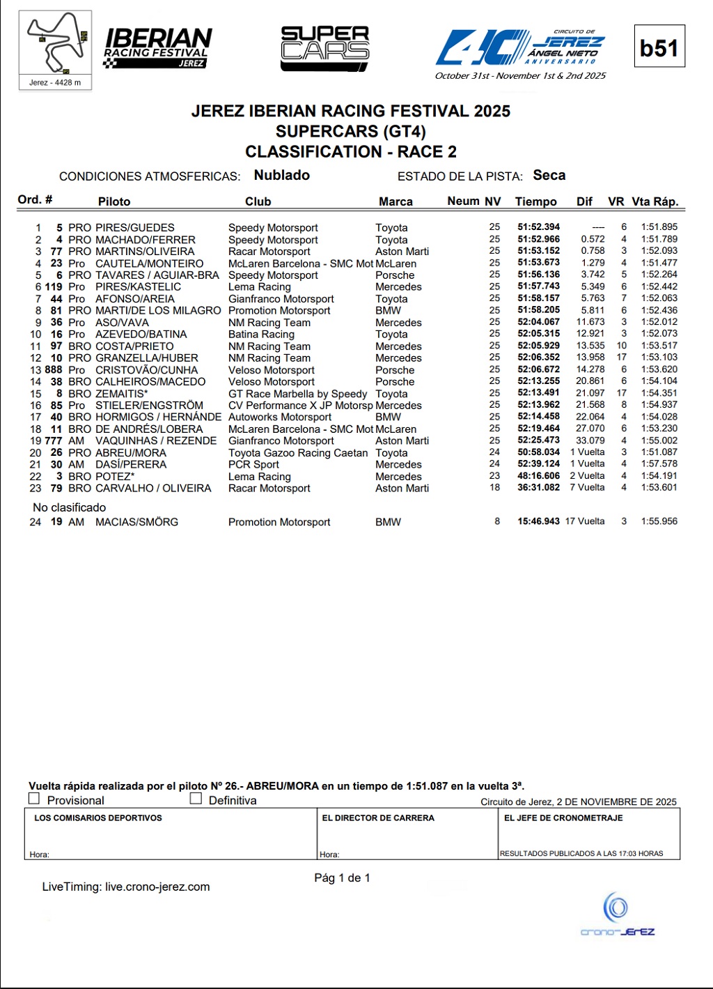 A vitória na corrida sorriu a José Carlos Pires e Tomás Guedes, que levaram o Toyota GR Supra GT4 EVO2 da Speedy Motorsport ao triunfo após largarem de 5.º lugar. A formação liderada por Pedro Salvador assinou uma dobradinha com César Machado e Adrián Ferrer, depois de uma prova cirúrgica e consistente. O pódio ficou completo com Mathieu Martins e Henrique V. Oliveira.
