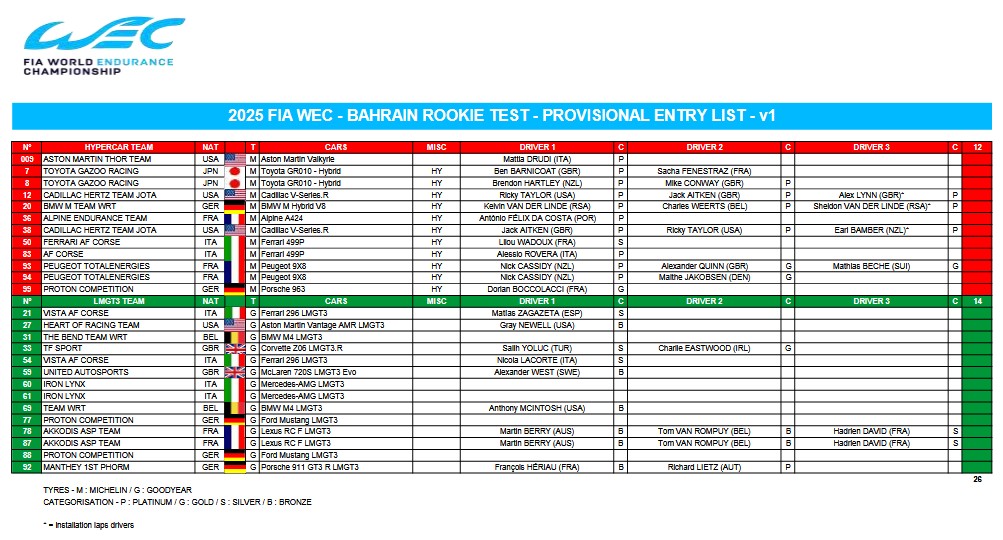 The five hours of running at Bahrain International Circuit will begin at 10:00 local time (08:00 CET) on Sunday, 9 November, with teams able to continue adding drivers to the entry list between now and the start of the test.