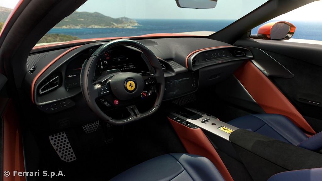Like the Ferrari Amalfi, the cabin features a dual-cockpit layout and an evolved driver–car interface. Key elements include the steering wheel with physical buttons, the return of the iconic start button, the integrated central display, and controls designed for natural interaction even during the most dynamic driving. The 2+ configuration enhances practicality, with rear seats suitable for travelling with children or increasing load capacity. Completing the experience, an integrated wind deflector built into the rear bench backrest, and operated at the touch of a button, improves comfort by reducing turbulence during open-top driving.