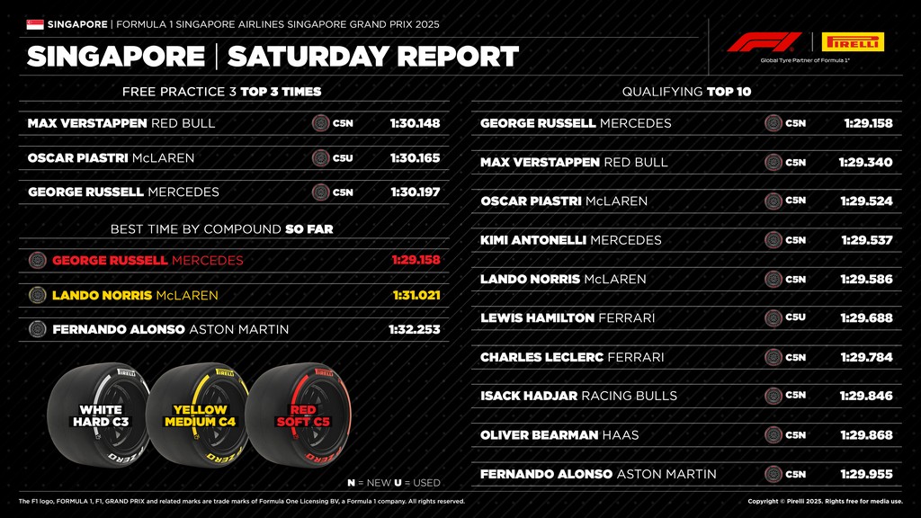 Starting alongside him on the front row will be Red Bull Racing’s Max Verstappen (1’29 “340) who yet again just missed out on the number one slot that still eludes him at this track. The second row sees Oscar Piastri third for McLaren in 1’29”524 and Andrea Kimi Antonelli (1’29”537) fourth in the other Mercedes. The Pirelli Pole Position Awards was presented to Russell by Alan Walker. The Norwegian DJ and producer achieved worldwide success in 2015 with his track “Faded.” His electronic music tracks have been streamed over a hundred billion times with nearly 36 billion views on YouTube. After the Walkerworld tour in Europe and North America, the artist performed today in Singapore just before the Grand Prix qualifying session.