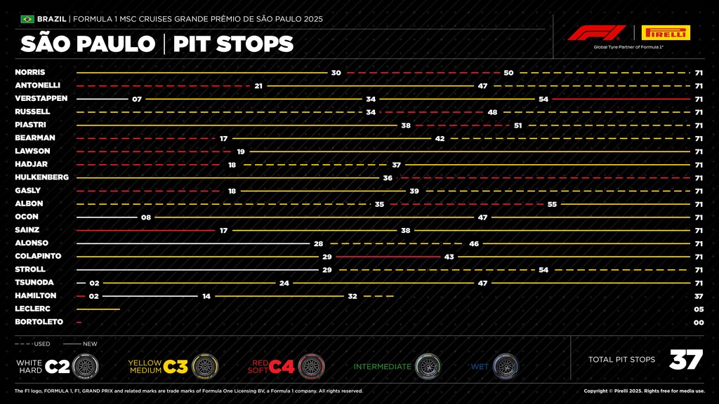 At the start, all three compounds were seen on the grid, with Antonelli in second selecting the soft tyres to try to out-drag polesitter Norris on the mediums. However, a safety car on the opening lap, subsequently followed by a virtual safety car, neutralised the action and also had the effect of reducing energy demands through the tyres at a crucial point In the race with cars full of fuel.
