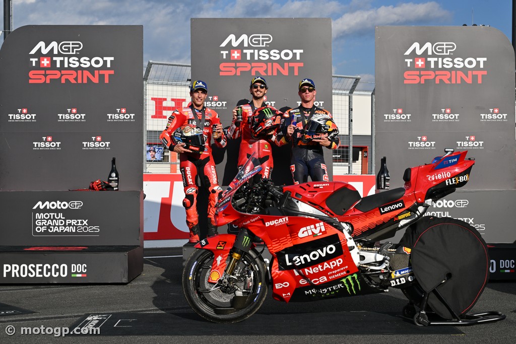 Francesco Bagnaia: back in business. Ducati Lenovo Team's double MotoGP World Champion returned to form with an almighty bang as the Italian cruised to a Tissot Sprint gold medal at the Motul Grand Prix of Japan, beating teammate Marc Marquez by 1.8s. The latter, meanwhile, takes a huge stride towards being crowned 2025 MotoGP World Champion on Sunday with that P2, because Alex Marquez (BK8 Gresini Racing MotoGP) finished P10, meaning no points were scored in the blue corner. And after a slightly dramatic day, Pedro Acosta (Red Bull KTM Factory Racing) salvaged a Saturday P3 for the Austrian manufacturer.