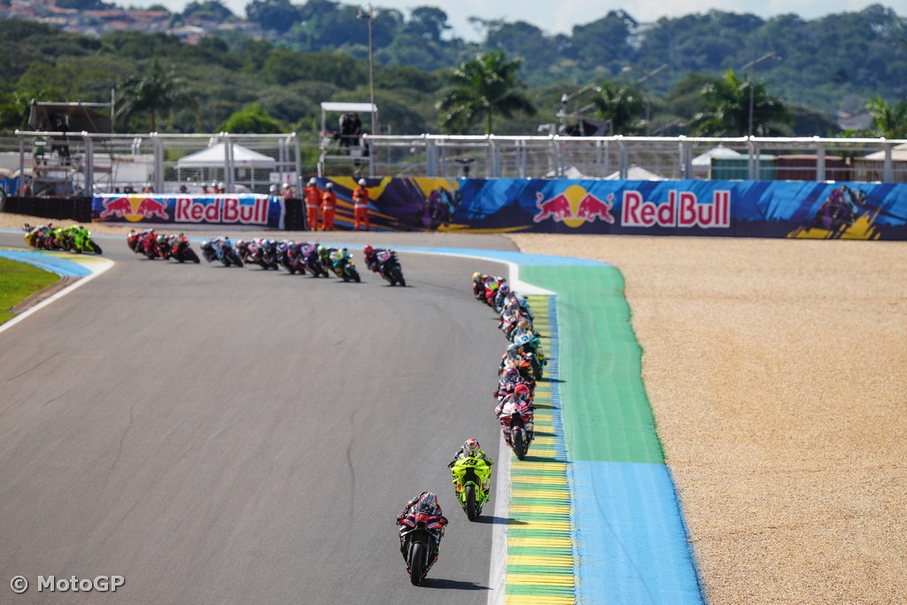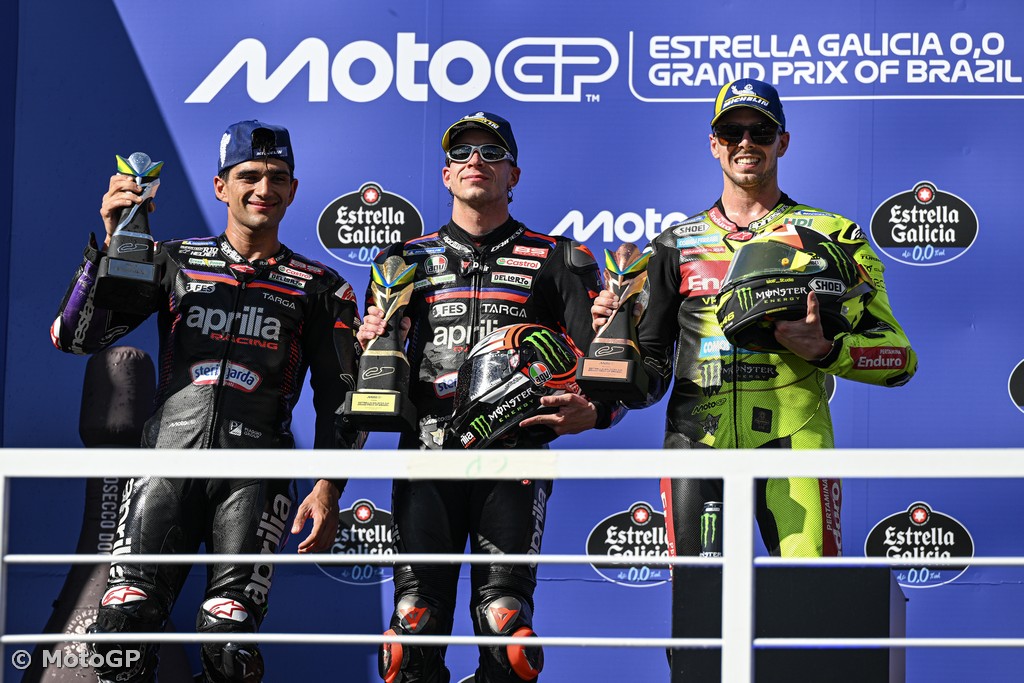History = made! MotoGP is back in Brazil and Marco Bezzecchi is back on top as the Aprilia Racing rider took a stunning fourth Grand Prix win in a row in Brazil, and for the first time in Aprilia's history. To add to the headlines for the Noale factory, teammate Jorge Martin takes second place to back up his awesome return to the rostrum on Saturday. Completing the podium, Fabio Di Giannantonio (Pertamina Enduro VR46 Racing Team) defeated Marc Marquez (Ducati Lenovo Team) on their rematch after the Sprint showdown, the #49 turning the tables in style.