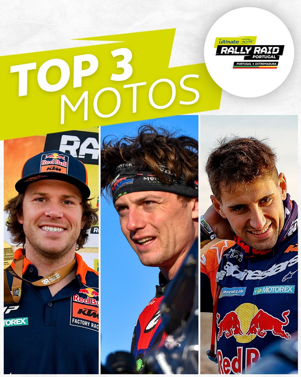 O pódio das motos ficou completo com o Espanhol, Tosha Schareina (Honda CRF 450 Rally). “Queria vencer a etapa e estive sempre ao ataque. Era muito difícil ganhar a prova depois do erro de percurso de ontem, mas estou satisfeito com o segundo lugar. Fizemos um bom trabalho”. O Argentino Luciano Benavides (KTM 450 Rally), que venceu a derradeira etapa, foi o terceiro classificado da geral. “A etapa foi muito bonita. Estava muito vento, mas como tinha uma boa aderência consegui ser rápido e divertir-me bastante. Foi a primeira vez que corri em Portugal e estou muito feliz com este pódio”, afirmou.
