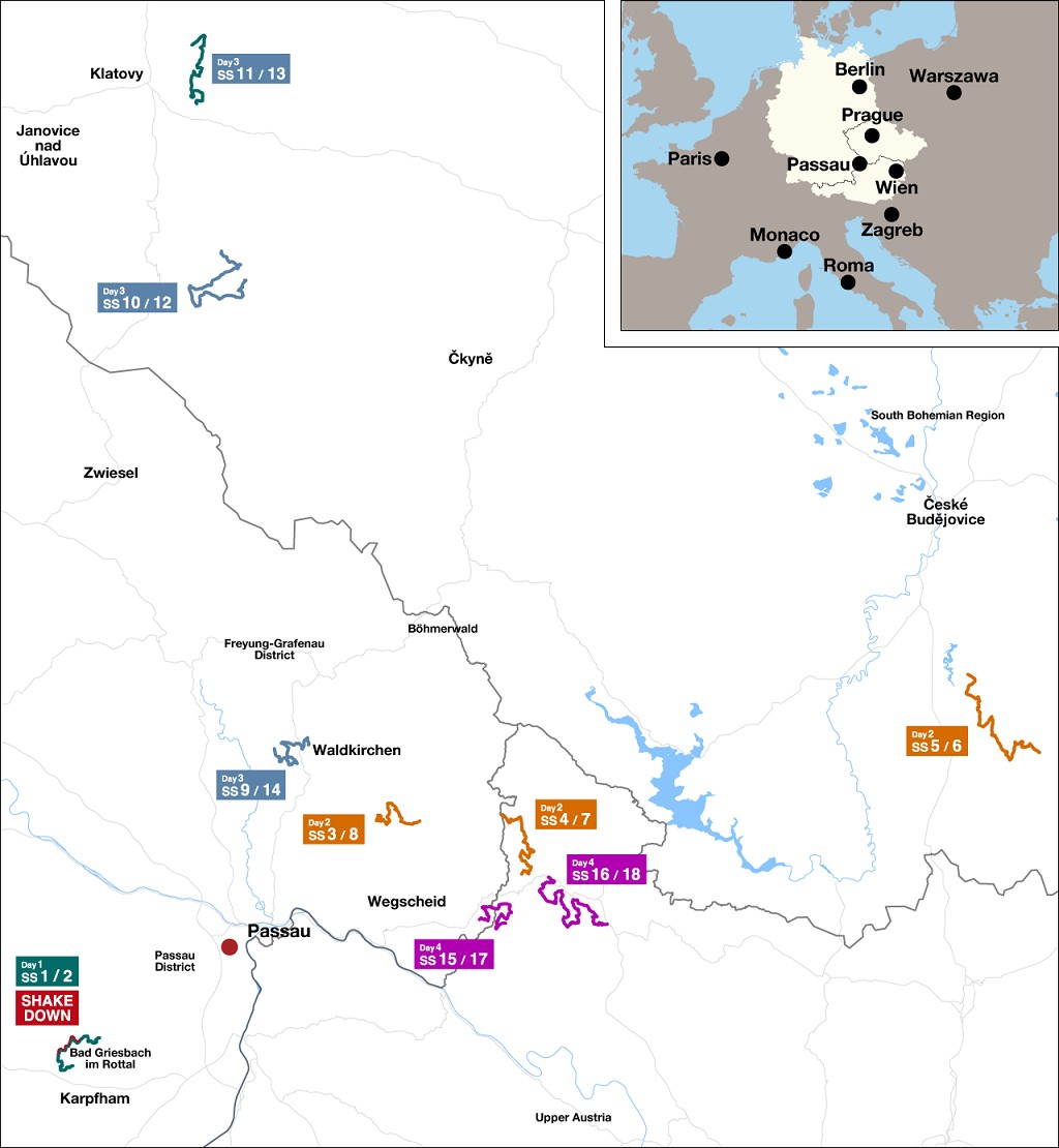 This year the rally starts from Passau with two passes of a stage around Bad Griesbach on Thursday afternoon. Friday’s route features one stage in each of the three countries, each to be run twice. Saturday then has one German stage and two on Czech roads, each run twice. Sunday’s final day features two passes of Beyond Borders (spanning Germany and Austria) and the all-Austrian Mühltal test, the second pass of which serves as the rally-ending Power Stage.