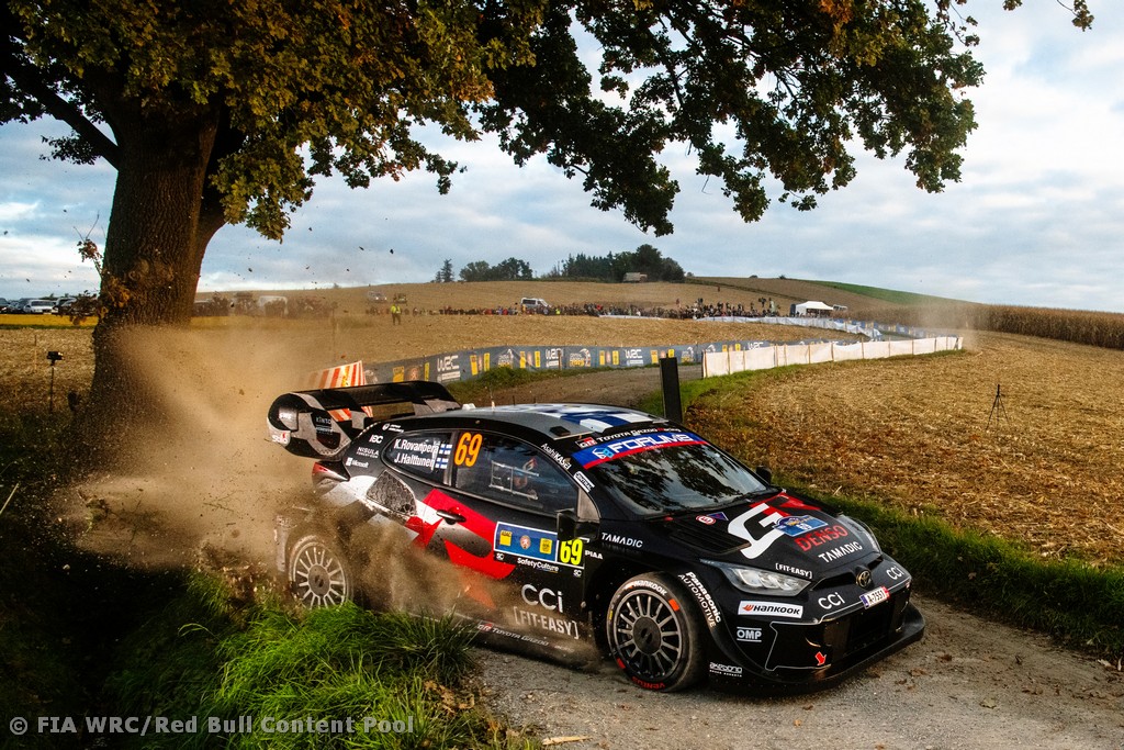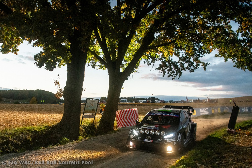 Elfyn Evans, marking co-driver Scott Martin's 200th WRC start, rounded out the all-GR Yaris podium. The Welshman topped the final 10.86km Granit und Wald test under full darkness, trimming his gap to the leaders to 29.5sec and reclaiming ground after being handed a five-second penalty on Thursday evening for hitting a haybale chicane.