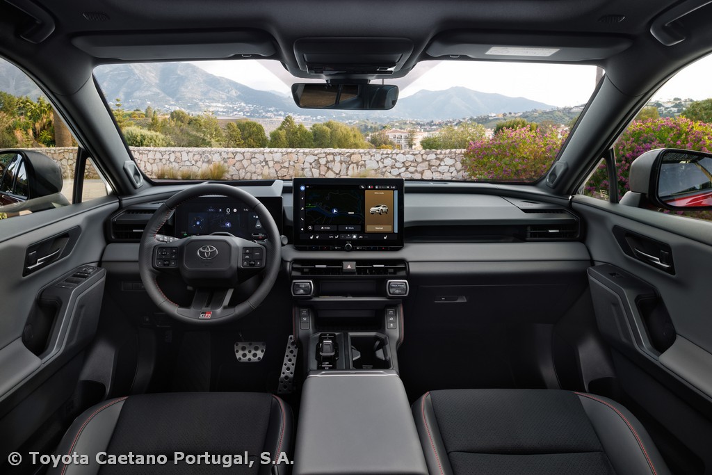 As configurações exclusivas da direção assistida eletrónica foram ajustadas especificamente para o RAV4 GR SPORT, para proporcionar uma sensação de direção mais sólida e desportiva. No interior, um elegante acabamento em preto destina-se a incentivar a concentração na estrada à frente. Apresenta logótipos GR e pesponto a vermelho no volante e na consola central na zona dos joelhos, bem como nos bancos em pele sintética e revestimento tipo camurça. Os pedais de travão e acelerador em alumínio foram desenvolvidos especificamente para uma condução desportiva mais confortável.