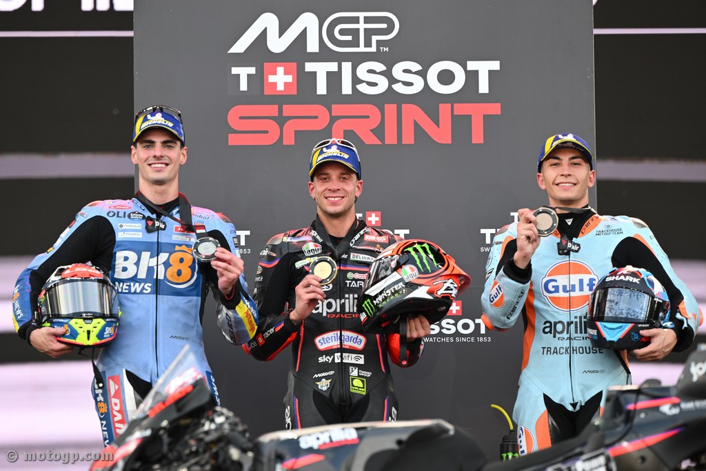 Marco Bezzecchi vs Fermin Aldeguer. Aprilia Racing’s Italian vs BK8 Gresini Racing’s rookie, and boy was it a Pertamina Grand Prix of Indonesia Tissot Sprint treat that we'll remember for a long time. It was Bezzecchi who completed an incredible comeback after a poor start to overtake the Ducati rider on the final lap for the gold medal, as Raul Fernandez (Trackhouse MotoGP Team) took P3 from the front row to earn his first rostrum in MotoGP.