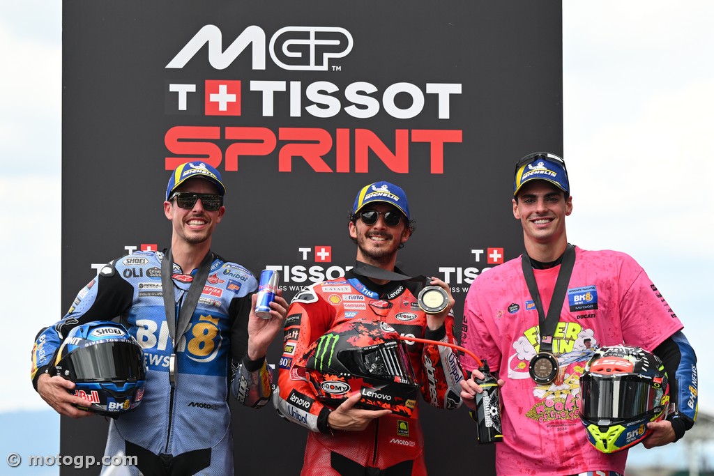 There was simply no stopping Francesco Bagnaia (Ducati Lenovo Team) on Saturday at the PETRONAS Grand Prix of Malaysia. Pole position to Tissot Sprint victory – back with a bang. The double MotoGP World Champion made it look easy to beat Alex Marquez (BK8 Gresini Racing MotoGP) by 2.2s, with that result officially handing the #73 second in the championship to make it a Marquez brother 1-2. What an achievement for the family. And there was more to celebrate in the Gresini box because a P3 in the Tissot Sprint meant Fermin Aldeguer clinched the 2025 Rookie of the Year crown, despite a post-Sprint tyre pressure penalty costing the Spaniard his bronze medal.