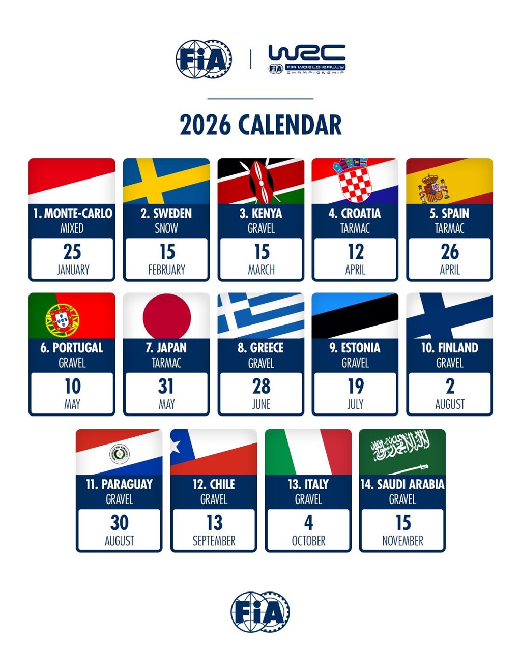 FIA President Mohammed Ben Sulayem said: "The 2026 WRC calendar is a powerful reflection of the championship's global strength and appeal. It combines the heritage of iconic rallies with the return of newer events in regions where participation and interest in rallying continues to grow."