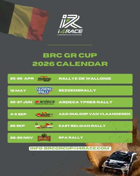 Already supported by Piragri Oil, Gego Team and MRF Tyres, the BRC GR Cup will feature six rounds in 2026: the Rallye de Wallonie (25 and 26 April), the Sezoensrally (16 May), the Ardeca Ypres Rally (26 and 27 June), the Omloop van Vlaanderen (4 and 5 September), the East Belgian Rally (26 September) and the Spa Rally (28 and 29 November). If you have any questions, please do not hesitate to write to us at This email address is being protected from spambots. You need JavaScript enabled to view it.