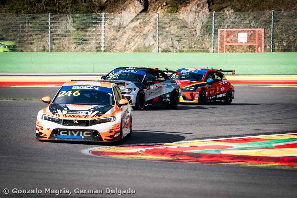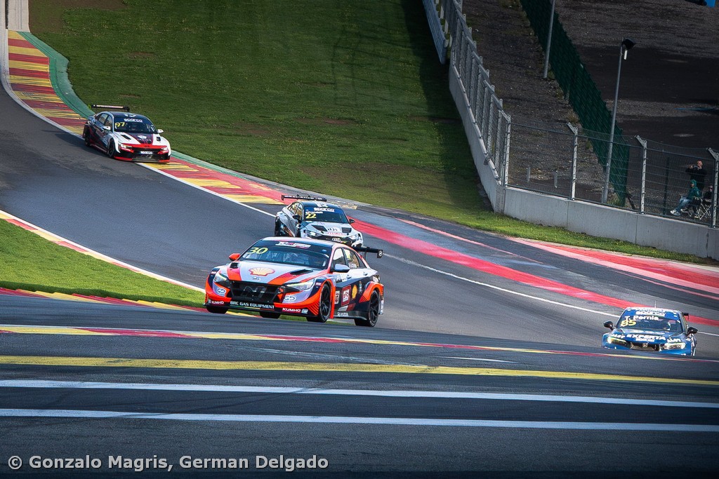 BRC Racing Team's Gabriele Covini led the way into La Source in his Hyundai Elantra N TCR, while contact between RC2 Racing Team's Victor Fernández and the PMA Motorsport driver Sandro Pelatti at the rear of the field propelled Pelatti’s CUPRA into the barriers at La Source. He’d later drag the car up to Les Combes before retiring.